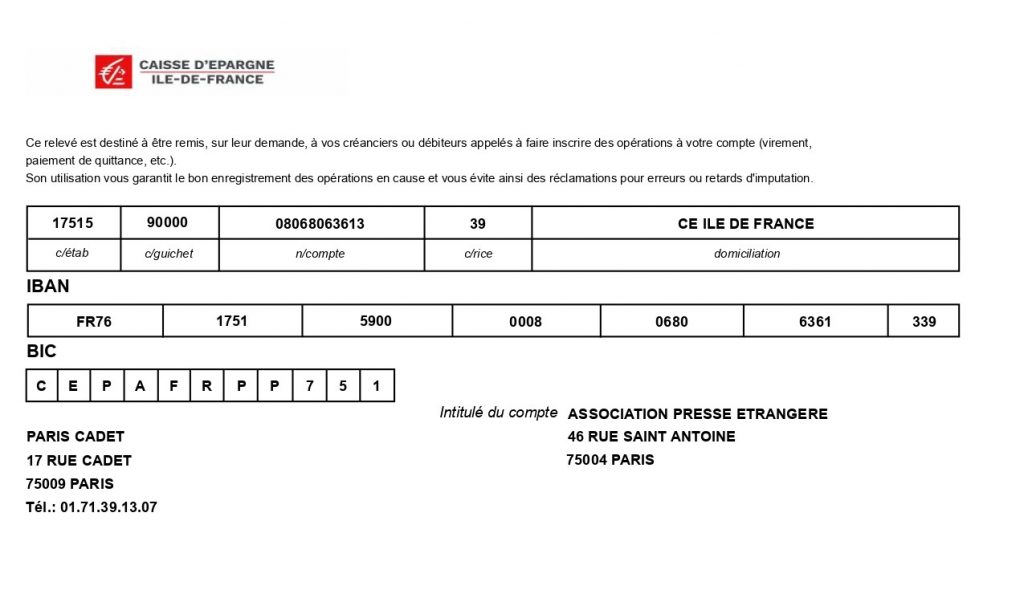 Veuillez trouver le RIB de notre banque.